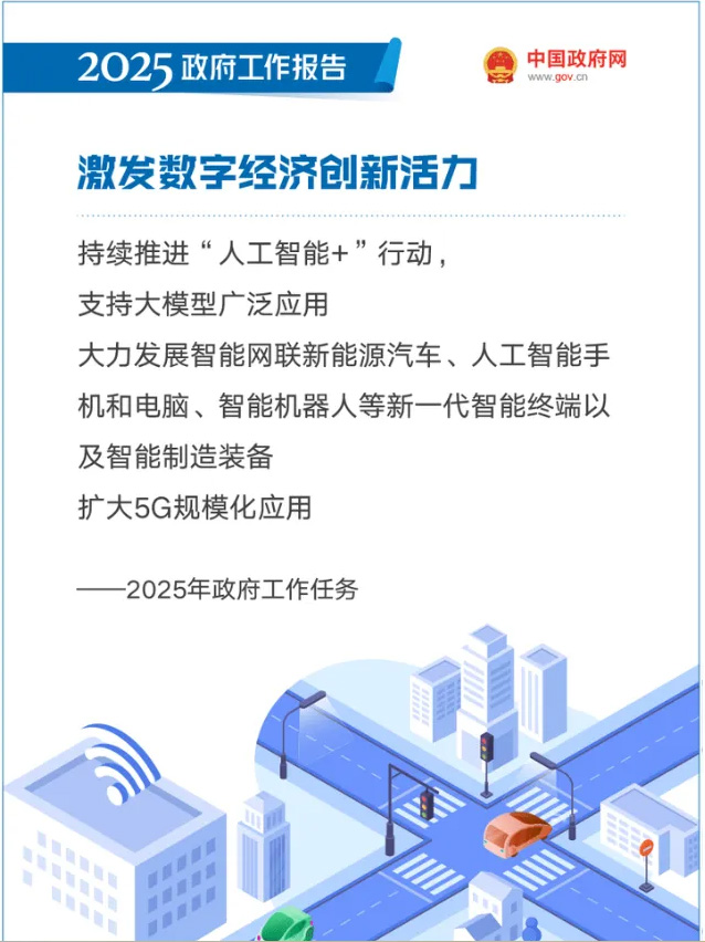 ● 持续推进"人工智能+"行动,将数字技术与制造优势、市场优势更好结合起来,支持大模型广泛应用,大力发展智能网联新能源汽车、人工智能手机和电脑、智能机器人等新一代智能终端以及智能制造装备。